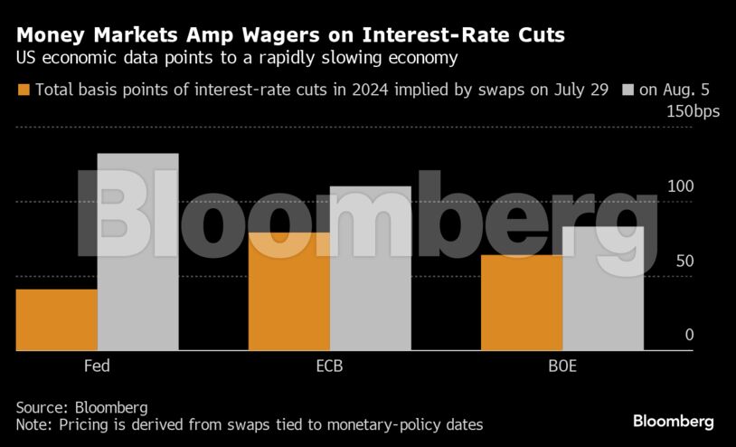 Οι επενδυτές ενισχύουν τα στοιχήματα για χαλάρωση της πολιτικής της Fed μετά την πρόσφατη σειρά των απογοητευτικών μακροοικονομικών στοιχείων. H αγορά των overnight indexed swaps εκτιμά τώρα περισσότερες μειώσεις των επιτοκίων τουλάχιστον 100 μονάδων βάσης έως το τέλος του έτους, σε σύγκριση με μόλις δύο πλήρεις κινήσεις τριμήνου που αναμένονταν πριν από μία εβδομάδα.