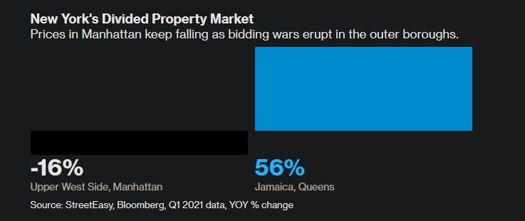 Oι τιμές των ακινήτων στις ΗΠΑ επέδειξαν αύξηση-ρεκόρ 30ετίας με ιδιαίτερες αυξήσεις στα προάστια των πόλεων και την επαρχία. Το Γκρένιτς προσέλκυσε πλούσιους επαγγελματίες που “ξέφευγαν” από τη Νέα Υόρκη και συνεχίζουν να προσέρχονται. Στο Μανχάταν οι πωλήσεις αυξάνονται, αλλά μόνο επειδή οι τιμές μειώνονται αφού οι περισσότεροι θέλουν να αποκεντρωθούν.