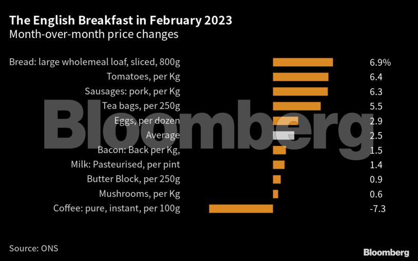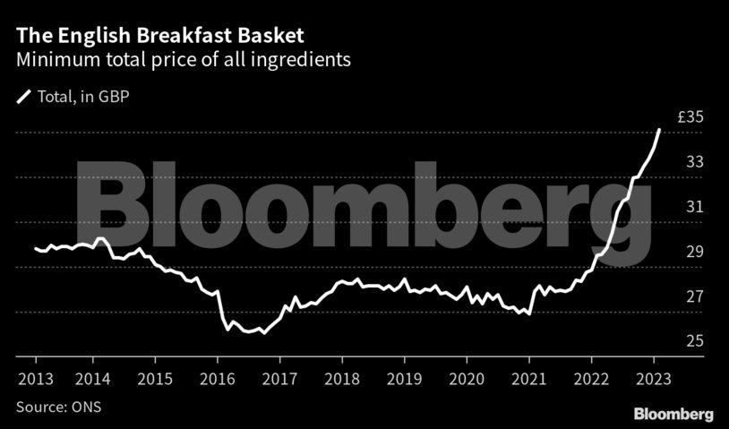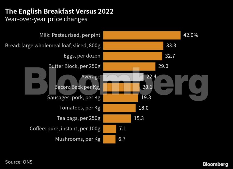 Σύμφωνα με το Bloomberg, ο μέσος όρος του κόστους των προϊόντων για την παρασκευή ενός παραδοσιακού πρωϊνού αυξήθηκε κατά 22% σε ετήσιο επίπεδο τον Φεβρουάριο. Σημειωτέον πως ο δείκτης βασίζεται σε στοιχεία τιμών προϊόντων όπως λουκάνικα, μπέικον, αυγά, ψωμί, βούτυρο, ντομάτες, μανιτάρια, γάλα, τσάι και καφέ τα οποία παρέχει το ΟΝS.
