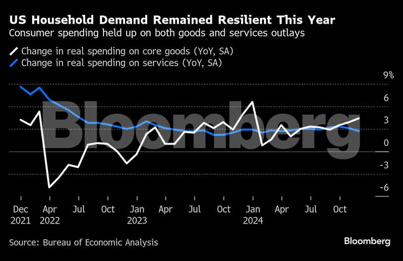 Οι αναλυτές του Bloomberg Economics εκτιμούν ότι οι δαπάνες των νοικοκυριών αυξήθηκαν κατά 2,8% το 2024 – ταχύτερα από ό,τι το 2023 και σχεδόν διπλάσιες από τις προβλέψεις τους στην αρχή του έτους.