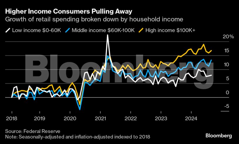 Οι καταναλωτικές δαπάνες καθοδηγούνται επίσης όλο και περισσότερο από τους υψηλότερα αμειβόμενους που απολαμβάνουν τα κέρδη στις τιμές των κατοικιών και το χρηματιστήριο. Αυτό λαμβάνει χώρα ενώ πολλοί καταναλωτές με χαμηλότερο εισόδημα βασίζονται σε πιστωτικές κάρτες και άλλα δάνεια για να στηρίξουν τις δαπάνες τους, με ορισμένους να εμφανίζουν σημάδια οικονομικής πίεσης, όπως υψηλότερα ποσοστά παραβατικότητας.