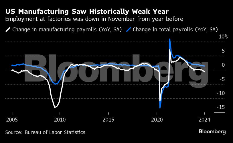 Ο τομέας μεταποίησης ήταν ένα ακόμη θύμα του αυξημένου κόστους δανεισμού. Οι επενδύσεις σε νέες κατασκευές παρεμποδίστηκαν από τα υψηλά επιτόκια και την ασθενέστερη ζήτηση στο εξωτερικό, ενώ πολλές επιχειρήσεις μείωσαν θέσεις εργασίας σε μια προσπάθεια εξοικονόμησης κόστους.