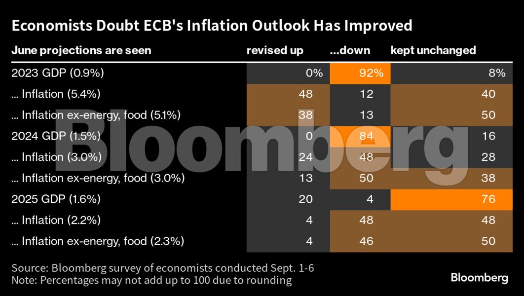 Η Ευρωπαϊκή Επιτροπή μείωσε τις προοπτικές της για την περιοχή αυτή την εβδομάδα. Η οικονομία θεωρείται τώρα ότι θα επεκταθεί μόλις κατά 0,8% φέτος και κατά 1,3% το 2024, υπό την πίεση της προβληματικής Γερμανίας. Η μεταστροφη αυτή στις προσδοκίες έρχεται μετά από αναφορές ότι οι νέες οικονομικές εκτιμήσεις της ΕΚΤ θα προβλέπουν πληθωρισμό άνω του 3% για το 2024, ενισχύοντας την αναγκαιότητα της περαιτέρω σύσφιγξης.