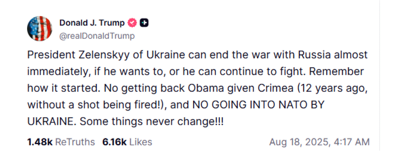 Σε ανάρτησή του στο Truth Social, ο Τραμπ δήλωσε ότι ο Ζελένσκι «μπορεί να τερματίσει τον πόλεμο σχεδόν άμεσα, αν το θελήσει, ή να συνεχίσει να πολεμά». Παράλληλα, υπαινίχθηκε ότι η Κριμαία δεν θα επιστραφεί και ότι η Ουκρανία δεν θα ενταχθεί στο ΝΑΤΟ.