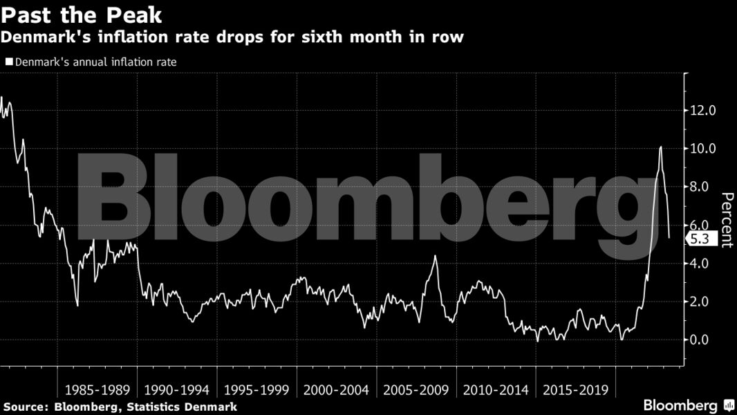 Ο ετήσιος ρυθμός αύξησης των τιμών καταναλωτή διαμορφώθηκε στο 5,3% τον Απρίλιο, από 6,7% τον Μάρτιο, όπως ανακοίνωσε η Στατιστική Υπηρεσία της Δανίας την Τετάρτη. Η πτώση κατά 1,4 ποσοστιαίες μονάδες ήταν η μεγαλύτερη σε μηνιαία βάση από το 1981 τουλάχιστον, σύμφωνα με τα στοιχεία που συγκέντρωσε το Bloomberg.