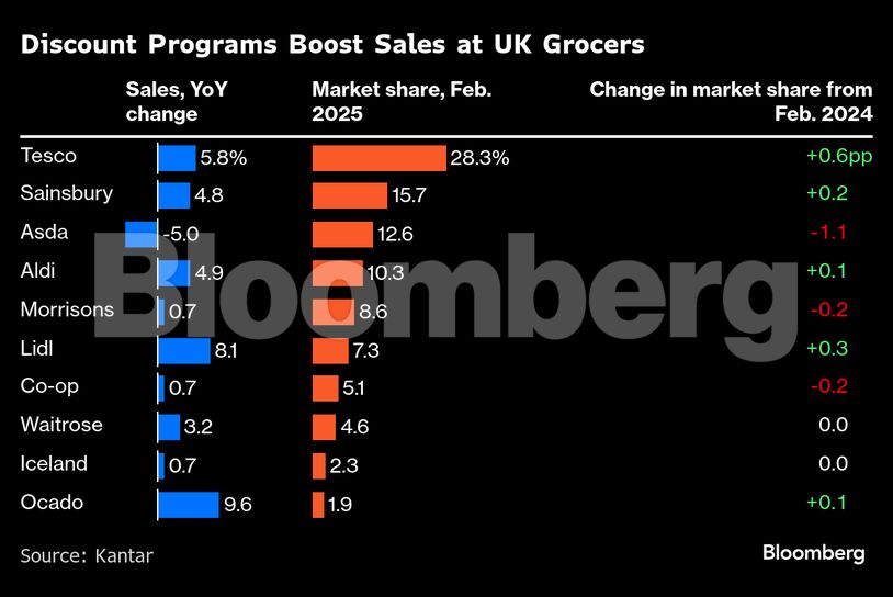 Οι πωλήσεις της Tesco, του μεγαλύτερου παντοπωλείου της Βρετανίας, αυξήθηκαν κατά 5,8% τις 12 εβδομάδες έως τις 23 Φεβρουαρίου, εν μέρει χάρη στο πρόγραμμα Clubcard. Τα εκπτωτικά παντοπωλεία παρουσίασαν επίσης μεγαλύτερη δραστηριότητα κατά την περίοδο αυτή, με τη Lidl να καταγράφει αύξηση των πωλήσεων κατά 8,1%.