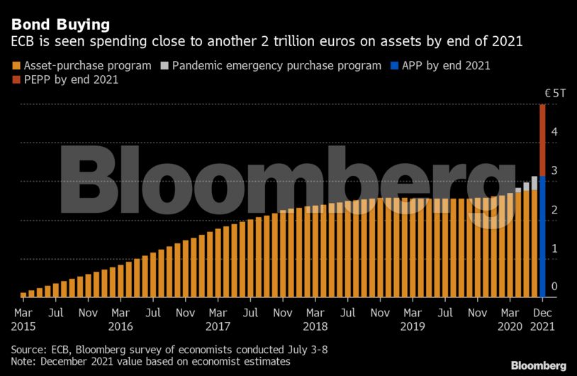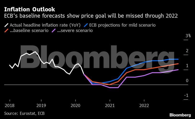 Σύμφωνα με τις προβλέψεις της ΕΚΤ, που θα αναθεωρηθούν τον Σεπτέμβριο, ο πληθωρισμός θα παραμείνει αρκετά κάτω από τον στόχο της ΕΚΤ τουλάχιστον μέχρι το 2022.