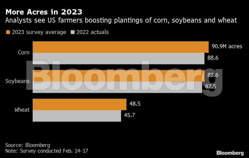 Σύμφωνα με το Bloomberg, οι γεωργοί αναμένεται να σπείρουν περισσότερο καλαμπόκι, σόγια και σίτο σε σχέση με πέρυσι. Παρ’ όλα αυτά, το αμερικανικό Υπουργείο Γεωργίας υπογράμμισε πως τα έσοδα των αγροτών ενδέχεται να μειωθούν κατά 16% το 2023 μετά από μία διετία αυξημένης κερδοφορίας. Τα futures του σίτου στην αγορά του Σικάγο έχουν καταγράψει μείωση μετά από μία χρονιά η οποία χαρακτηρίστηκε από αυξημένη μεταβλητότητα.