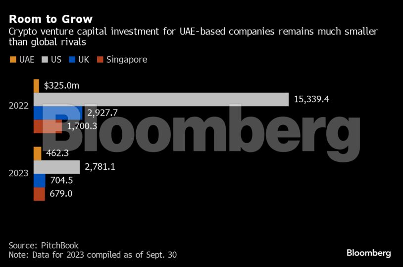 H επιρροή των ΗΑΕ στον κλάδο των κρυπτονομισμάτων παραμένει περιορισμένη σε σύγκριση με τα παραδοσιακά hot spots. Οι εταιρείες με έδρα τη χώρα συγκέντρωσαν $462,3 εκατ. από venture capital εταιρείες φέτος, σύμφωνα με δεδομένα της Pitchbook. Συγκριτικά, οι ΗΠΑ έχουν συγκεντρώσει $2,8 δισ. και η Βρετανία $704,5 εκατ.