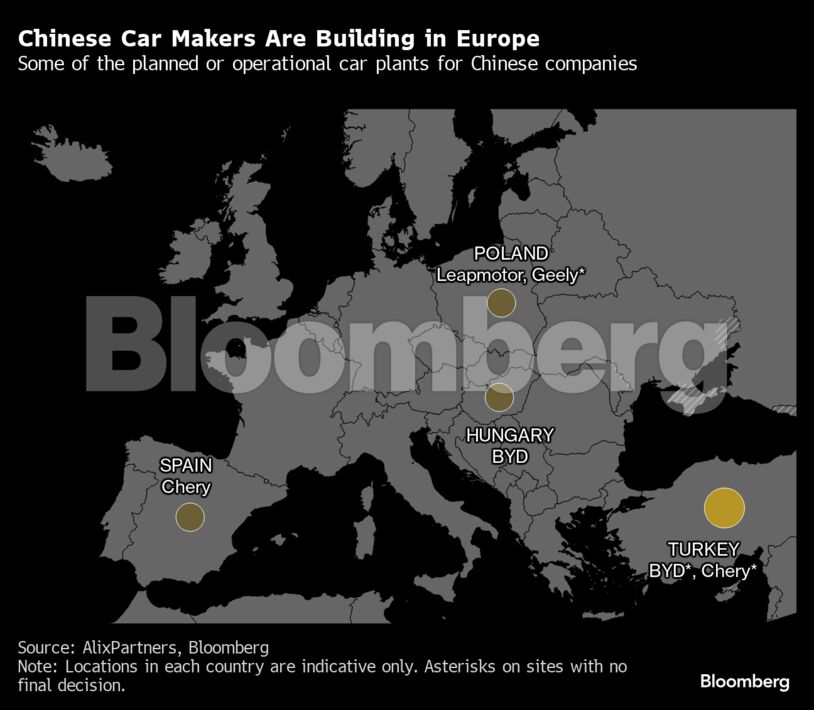 Η Βαρκελώνη θα «φιλοξενήσει» σύντομα το Omoda E5, που κατασκευάζεται από την κινεζική Chery Automobile Co., η οποία έχει συνεργαστεί με την ισπανική Ebro-EV Motors. Στην Πολωνία, τα αυτοκίνητα πόλης T03 της κινεζικής Leapmotor παράγονται από γραμμή συναρμολόγησης που ανήκει στην Stellantis NV. Εν τω μεταξύ, η BYD Co. έχει ανακοινώσει σχέδια για το δικό της εργοστάσιο στην Ουγγαρία, με ένα άλλο να μελετάται για την Τουρκία, ενώ η Zeekr σταθμίζει τη χρήση εγκαταστάσεων παραγωγής που ανήκουν στη Geely.