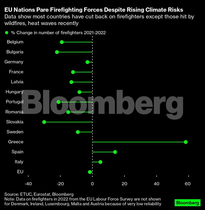 Οι μόνες χώρες οι οποίες αύξησαν το πυροσβεστικό προσωπικό τους, ήταν η Ελλάδα, η Ισπανία και η Ιταλία. Η Ελλάδα, σύμφωνα με το Bloomberg, αύξησε το πυροσβεστικό της προσωπικό κατά 60% το 2022, κάτι το οποίο αποδείχθηκε σωτήριο κατά τη διάρκεια των σοβαρών πυρκαγιών του φετινού καλοκαιριού και της εκκένωσης χιλιάδων ατόμων από τη Ρόδο. Σύμφωνα με τον Υπουργό Κλιματικής Κρίσης και Πολιτικής Προστασίας, Βασίλη Κικίλια, μάλιστα, θα λάβουν χώρα 500 νέες προσλήψεις πυροσβεστών.