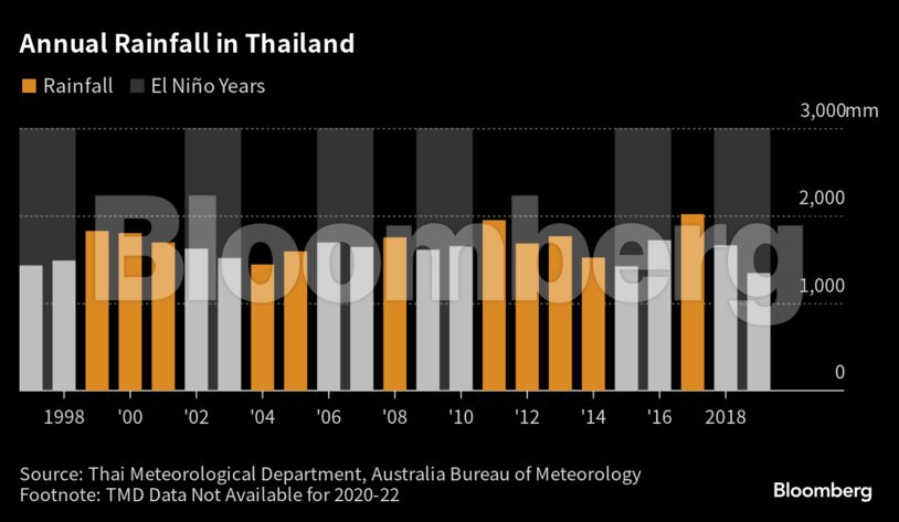 Οι βροχοπτώσεις στη χώρα αναμένεται να κυμανθούν 10% υπό του μέσου εποχικού όρου των μουσώνων, ενώ το φαινόμενο Ελ Νίνιο θα μπορούσε, παράλληλα, να περιορίσει το ποσοστό αυτό ακόμα περισσότερο. Η Ταϊλάνδη, σύμφωνα με τις εκτιμήσεις των ειδικών, θα αντιμετωπίσει την εκτεταμένη αυτή ξηρασία από το 2024 και ύστερα.