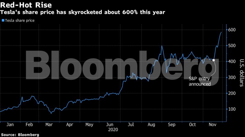 H Tesla πρόκειται να ενταχθεί στον δείκτη S&P 500 την 21η Δεκεμβρίου. Η κίνηση αυτή αναμένεται να προκαλέσει αναταραχές σε ολόκληρη την αγορά, με τους επενδυτές να προσπαθούν να… δημιουργήσουν χώρο στα χαρτοφυλάκιά τους ώστε να μπορούν να αγοράσουν κάποιες από τις μετοχές της εταιρείας των $538 δισεκατομμυρίων.