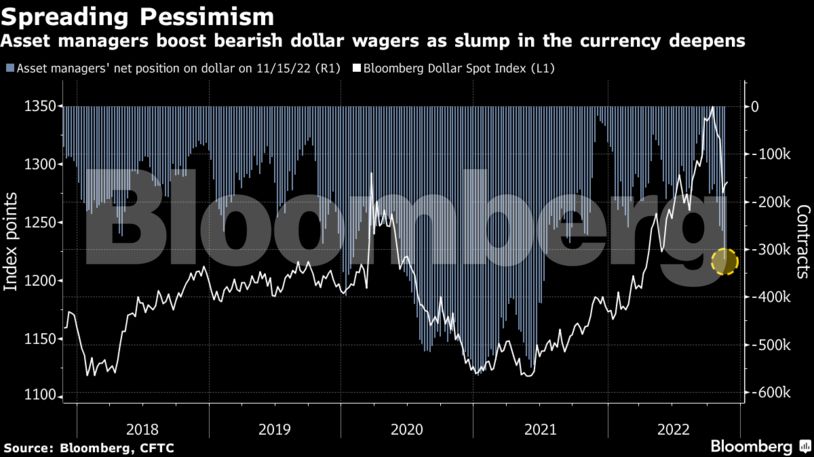 Πολλοί επενδυτές έχουν αυξήσει τα αισιόδοξα (bullish) στοιχήματά τους σε ό,τι αφορά την ισοτιμία του ευρώ, μειώνοντας παράλληλα και τις short τοποθετήσεις τους σε γεν και στερλίνες. Ο δείκτης Bloomberg Dollar Spot Index έχει καταγράψει μείωση άνω του 5% από το υψηλό Σεπτεμβρίου.