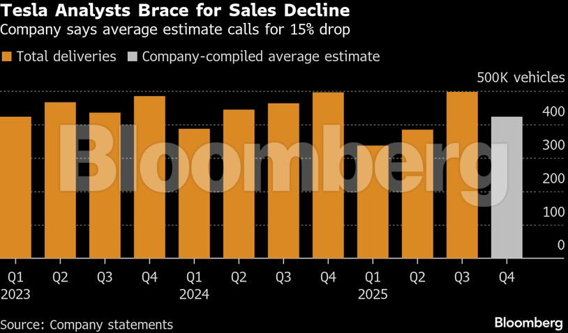 Σύμφωνα με τους υπολογισμούς της ίδιας της Tesla, οι αναλυτές αναμένουν κατά μέσο όρο παραδόσεις 422.850 οχημάτων στο τέταρτο τρίμηνο, αριθμός μειωμένος κατά 15% σε ετήσια βάση. Αντίθετα, ο μέσος όρος που έχει συγκεντρώσει το Bloomberg ανεβάζει τις εκτιμήσεις στις 445.061 παραδόσεις, που αντιστοιχούν σε πτώση περίπου 10% σε σχέση με την αντίστοιχη περίοδο του 2024.