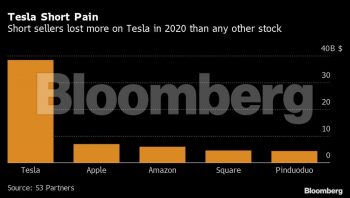 Συγκεκριμένα η άνοδος της μετοχής της Tesla κατά έως και 730% κόστισε στους short sellers 38 δισ.δολάρια φέτος, σύμφωνα με στοιχεία της S3 Partners. Ως μέτρο σύγκρισης η αμέσως επόμενη απώλεια ύψους σχεδόν 7 δισ. δολαρίων για τους short sellers είναι από τις μετοχές της Apple.