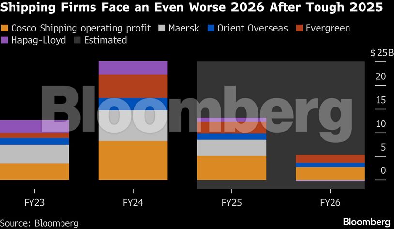 Η δανική A.P. Moller-Maersk A/S, η γερμανική Hapag-Lloyd AG, η ιαπωνική Nippon Yusen KK και οι κινεζικές Orient Overseas International Ltd. και Cosco Shipping Holdings Co. αναμένεται να αναφέρουν χαμηλότερα κέρδη το 2026, μετά από ένα ήδη δύσκολο 2025 που σημαδεύτηκε από αναταραχές στους δασμούς.