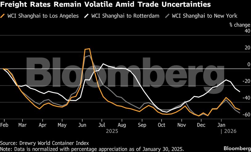 Οι ομόλογοί τους στην Ασία αντιμετωπίζουν παρόμοιες προκλήσεις. Η πλήρης επαναλειτουργία της διαδρομής της Ερυθράς Θάλασσας θα είναι «το ατού» που πρέπει να παρακολουθήσουμε στην ασιατική ναυτιλία φέτος — περισσότερο από τους δασμούς, δεδομένης της εμπορικής εκεχειρίας μεταξύ ΗΠΑ και Κίνας και της συνεχιζόμενης αποσύνδεσης των δύο οικονομιών, σύμφωνα με τον αναλυτή του Bloomberg.