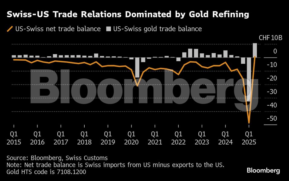 Οι εξαγωγές χρυσού αξίας άνω των 36 δισεκατομμυρίων δολαρίων κάλυψαν πάνω από τα δύο τρίτα του εμπορικού πλεονάσματος της Ελβετίας με τις ΗΠΑ στο πρώτο τρίμηνο, αν και οι τοπικές εταιρείες εκπροσωπούν μόνο μικρό μέρος της συνολικής αξίας. Ο χρυσός σε υψηλή αξία διακινείται συνεχώς, μεταφέροντας πολύτιμο μέταλλο από ορυχεία σε Νότια Αμερική και Αφρική μέσω τραπεζών στο Λονδίνο και στη Νέα Υόρκη.
