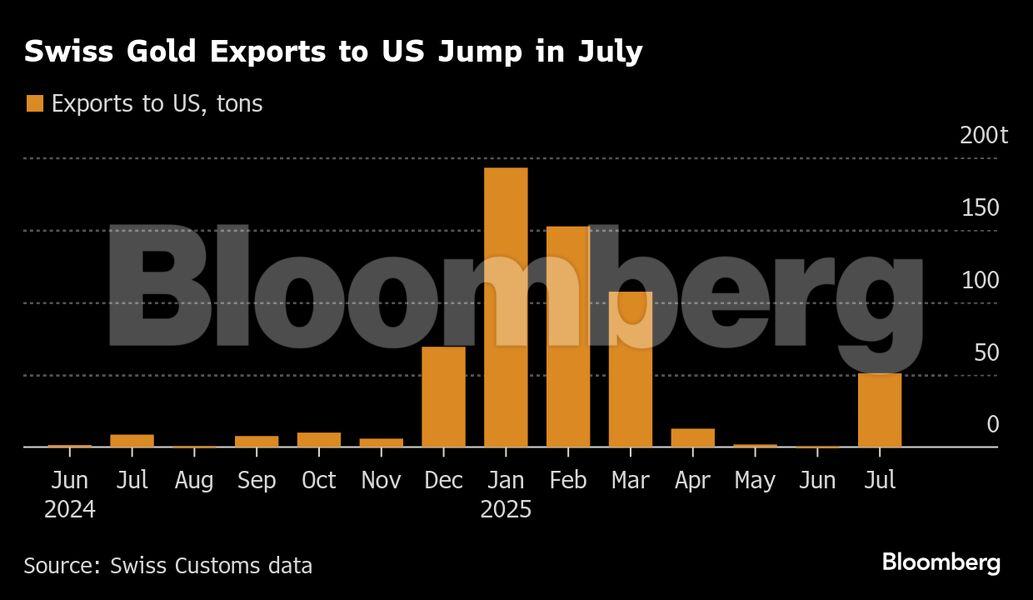 Οι αποστολές χρυσού από την Ελβετία —τον μεγαλύτερο κόμβο σε παγκόσμιο επίπεδο— προς τις ΗΠΑ αυξήθηκαν σε περίπου 51 τόνους τον Ιούλιο, από λιγότερο από 0,3 τόνους τον προηγούμενο μήνα. Το φετινό ρεκόρ σημειώθηκε τον Ιανουάριο, όταν 193 τόνοι χρυσού εξήχθησαν στις ΗΠΑ.
