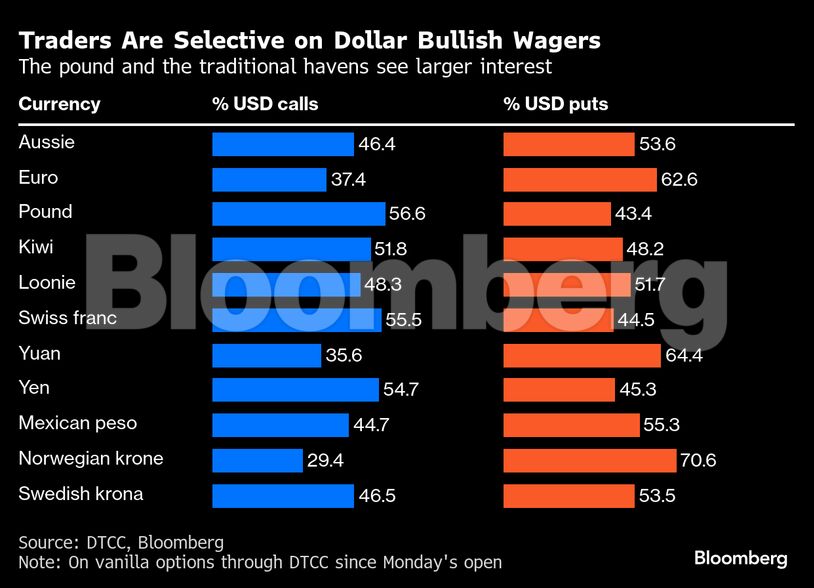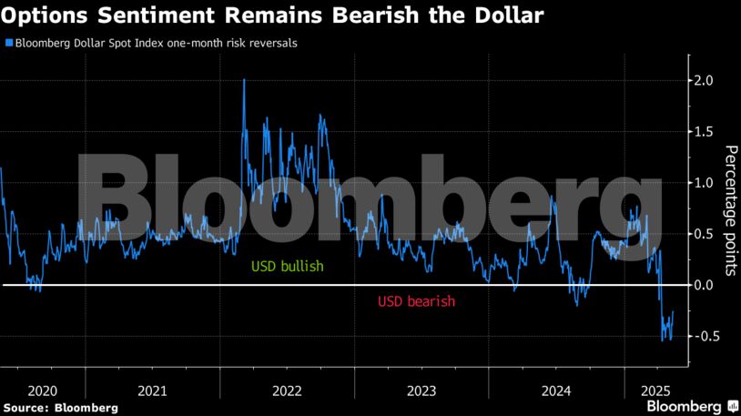 Τέλος, οι λεγόμενοι «risk reversals» -δείκτες που μετρούν τη ζήτηση για ανοδικές έναντι πτωτικών επιλογών- συνεχίζουν να καταδεικνύουν μακροπρόθεσμη απαισιοδοξία για το δολάριο, αν και με λιγότερη ένταση από την προηγούμενη εβδομάδα.