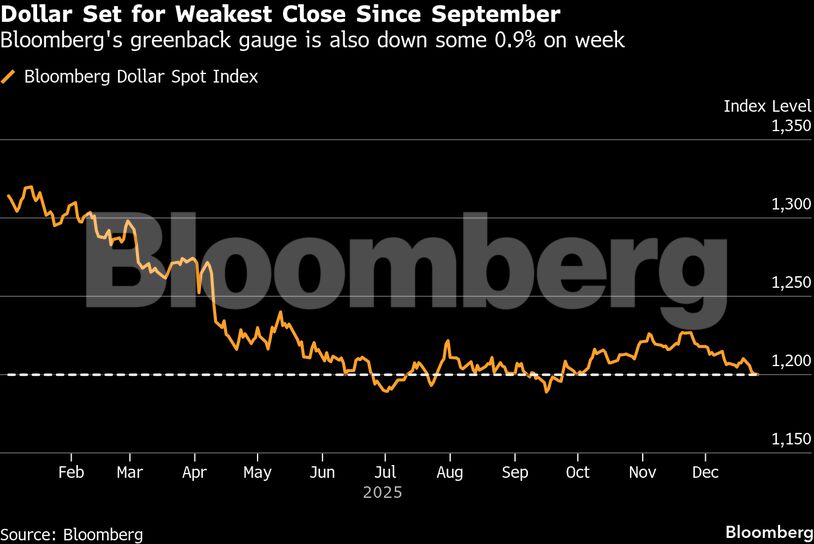 Ο δείκτης Bloomberg Dollar Spot υποχώρησε ελαφρά την Παρασκευή και σε επίπεδο εβδομάδας εμφανίζει πτώση περίπου 0,8%. Σε ετήσια βάση, η πτώση προσεγγίζει το 8%, γεγονός που —εφόσον επιβεβαιωθεί— θα συνιστά τη μεγαλύτερη ετήσια υποχώρηση από το 2017. Το αμερικανικό νόμισμα οδεύει επίσης προς το χαμηλότερο κλείσιμό του από τον Σεπτέμβριο, ενώ νομίσματα με μεγαλύτερη ευαισθησία στον κίνδυνο, όπως το αυστραλιανό δολάριο και η νορβηγική κορόνα, κατέγραψαν τις ισχυρότερες εβδομαδιαίες αποδόσεις έναντι του δολαρίου.