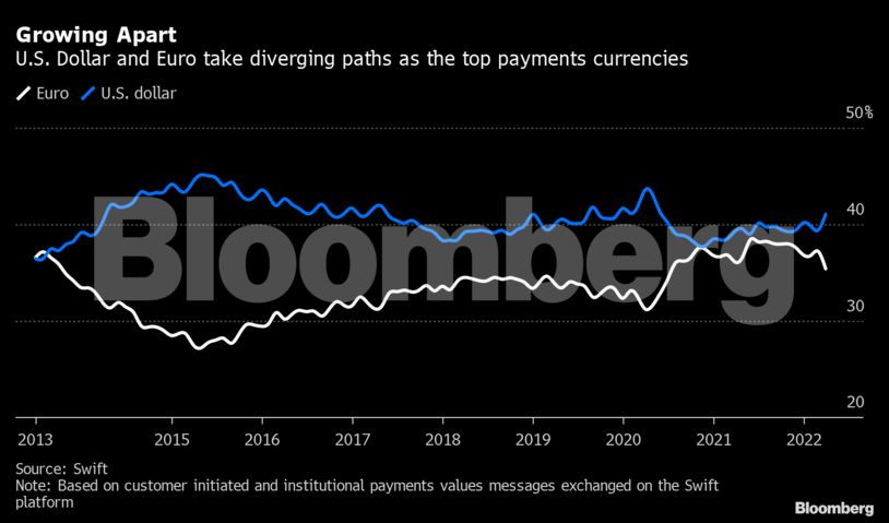 Oι συναλλαγές μέσω ευρώ μειώθηκαν στο 35,4%, σε νέο χαμηλό από την αρχή της πανδημίας, σύμφωνα με τα δεδομένα της SWIFT, η οποία συνέλεξε στοιχεία από 11.000 χρηματοπιστωτικά ιδρύματα και 200 χώρες. Υπενθυμίζεται πως η SWIFT απαγόρευσε την πρόσβαση στην πλατφόρμα της σε ρωσικές τράπεζες τον προηγούμενο μήνα λόγω των διεθνών κυρώσεων κατά της χώρας.