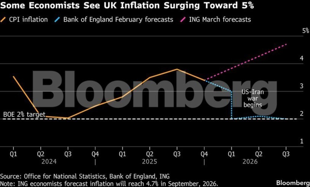 Ο οικονομολόγος της ING Τζέιμς Σμιθ εκτίμησε ότι ο ρυθμός αύξησης των τιμών θα μπορούσε να φτάσει στο 4,7% τον Σεπτέμβριο, εφόσον το ράλι του πετρελαίου συνεχιστεί κατά το δεύτερο τρίμηνο του έτους. Το Brent ξεπέρασε τα 100 δολάρια το βαρέλι για πρώτη φορά από το 2022.
