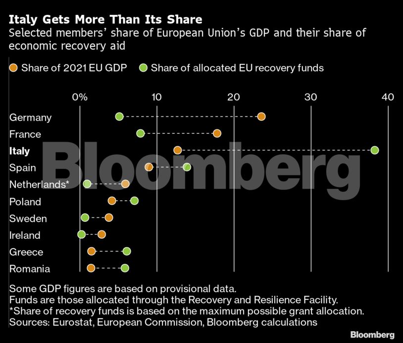 Το ρευστό ρέει άφθονο σε ολόκληρη την ευρωπαϊκή επικράτεια, χρηματοδοτώντας πρότζεκτ όπως την αναβάθμιση των πεπαλαιωμένων ψηφιακών υποδομών της Γερμανίας και τη σύνδεση των ελληνικών νησιών στο δίκτυο ηλεκτροδότησης της ηπειρωτικής Ελλάδας. Το 1/4 της χρηματοδότησης, όμως, προορίζεται για την Ιταλία η οποία αποτελεί και τον κύριο στόχο αναβάθμισης.