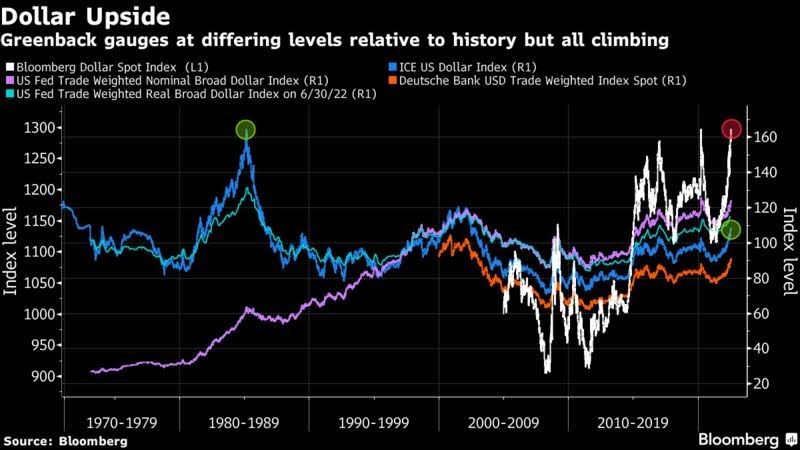 Μερικοί από τους κύριους δείκτες του δολαρίου ενδέχεται να καταγράψουν περαιτέρω αύξηση. Αν και ο δείκτης Bloomberg Dollar Spot Index άγγιξε υψηλό ρεκόρ τον περασμένο μήνα, καταγράφει στοιχεία μόλις από το 2004. Ο δείκτης ICE US Dollar Index, όμως, βρίσκεται σε χαμηλότερα επίπεδα από τα αντίστοιχα της δεκαετίας του ‘80. Το δολάριο θα χρειαστεί ένα περαιτέρω ράλι της τάξης του 54% για να αγγίξει το υψηλό ρεκόρ του 1985 όταν υπεγράφη η συμφωνία Plaza Accord.