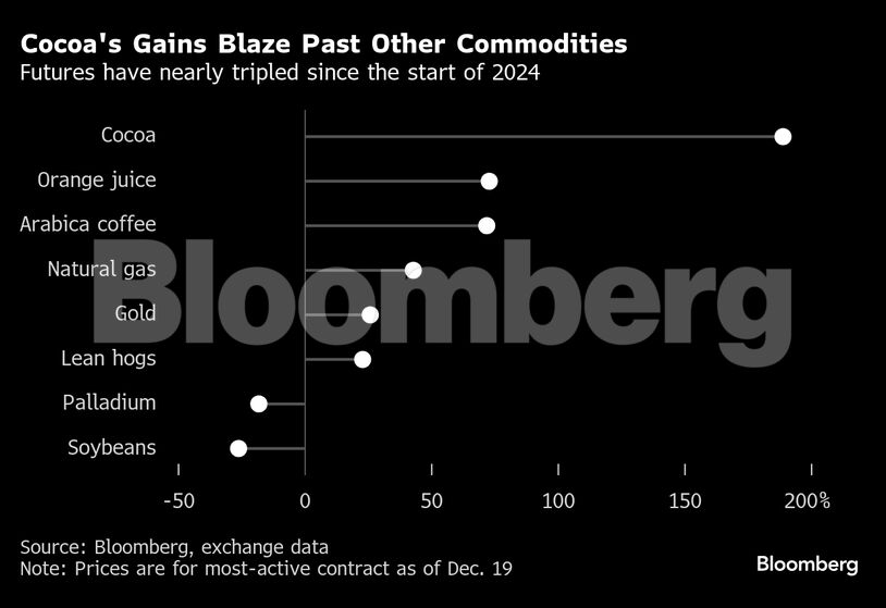 Οι τιμές του κακάο έχουν σχεδόν τριπλασιαστεί, καθώς η παραπαίουσα παραγωγή στη Δυτική Αφρική – τη μεγαλύτερη αναπτυσσόμενη περιοχή στον κόσμο – προκάλεσε μαζικές ελλείψεις στην προσφορά. Πολλοί έμποροι, που κάηκαν από την εκτίναξη του κόστους διατήρησης των θέσεων, εγκατέλειψαν την αγορά καθώς το ράλι κέρδιζε έδαφος, και οι παραγωγοί σοκολάτας έμειναν έξω από την αντιστάθμιση νέων αποθεμάτων σε μια προσπάθεια για χαμηλότερες τιμές.