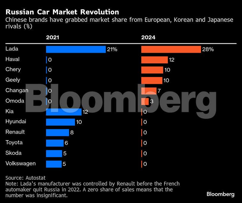 Οι κινεζικές μάρκες αντιπροσώπευαν το μεγαλύτερο μέρος των πωλήσεων, καθώς άλλες διεθνείς μάρκες αποσύρθηκαν. Ορισμένες, όπως η Mercedes-Benz Group AG, η Nissan Motor Co. Ltd., η Hyundai και η Renault SA είχαν αρχικά ρήτρες επαναγοράς οι οποίες θεωρητικά θα τους επέτρεπαν να διεκδικήσουν τα εργοστάσιά τους σε μειωμένη τιμή. Αυτό, όμως, δε θα είναι εύκολο. Ο επικεφαλής της AvtoVAZ, της μεγαλύτερης αυτοκινητοβιομηχανίας της Ρωσίας, δήλωσε ότι ο πρώην ιδιοκτήτης της, η Renault, θα πρέπει να καταβάλει αποζημίωση ύψους τουλάχιστον 112,5 δισεκατομμυρίων ρουβλίων για να καλύψει τις επενδύσεις που έγιναν από τότε που εγκατέλειψε τη Ρωσία, εάν η γαλλική αυτοκινητοβιομηχανία αναζητήσει επιστροφή του μεριδίου της.