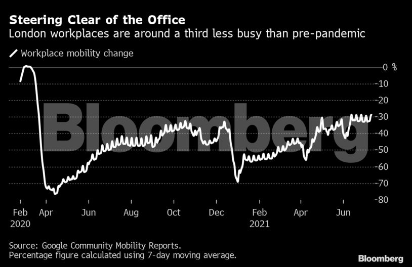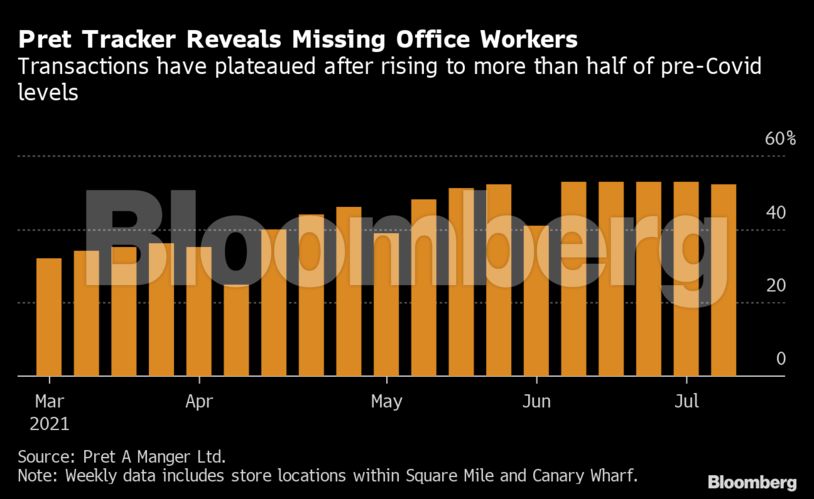 Τα μαγαζιά, τα καφέ, τα εστιατόρια, οι παμπ, έχουν ανοίξει από την άνοιξη. Ολοι αναμένουν την επιστροφή των καταναλωτών και των εργαζομένων στο Λονδίνο. Παρ’ όλα αυτά, τα στοιχεία του Bloomberg μέσω της λονδρέζικης αλυσίδας μαγαζιών σάντουιτς Pret A Manger Ltd επιδεικνύουν ανάκαμψη στο West End και στα προάστια αλλά όχι στο οικονομικό κέντρο του City και στο Canary Wharf, που φιλοξενούν τις τεράστιες επιχειρήσεις και τράπεζες.