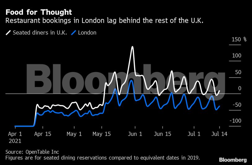 Τα… καλά νέα είναι πως οποιοσδήποτε θέλει να γευματίσει σε εστιατόριο θα βρει εύκολα τραπέζι. Δεδομένα της ΟpenTable Inc υποδεικνύουν πως οι κρατήσεις στο Λονδίνο ανακάμπτουν πολύ πιο αργά σε σχέση με την υπόλοιπη χώρα.