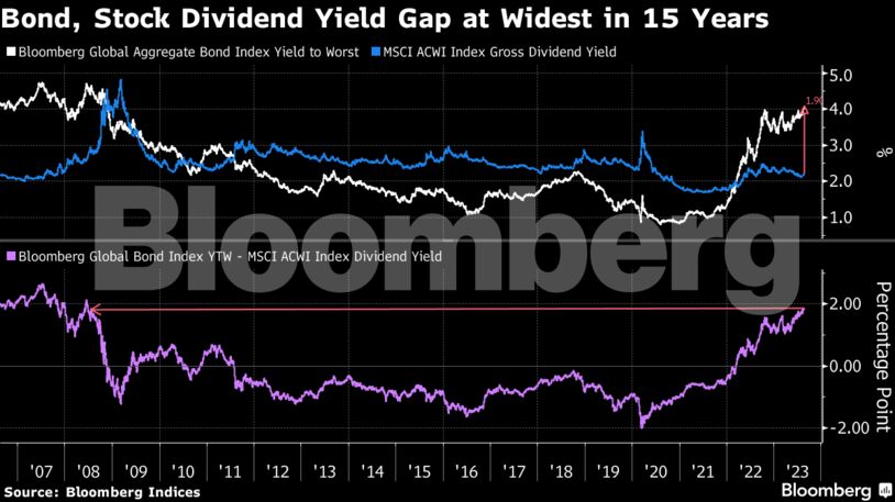 Οι επενδύσεις σε σταθερό εισόδημα προσφέρουν πολύ υψηλότερες αποδόσεις 180 μονάδων βάσης σε σχέση με τις μετοχές, σύμφωνα με έρευνα του Bloomberg. Το ρεκόρ 15ετίας αυτό ενδέχεται να συνεχιστεί, τη στιγμή που οι επενδυτές αναμένουν πως η εποχή των χαμηλών επιτοκίων έχει, πια, φτάσει στο τέλος της.