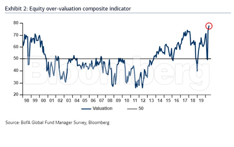 Ένα επιβλητικό 78% των ερωτηθέντων επενδυτών, ο μεγαλύτερος αριθμός από την έναρξη του θεσμού των συγκεκριμένων ερευνών το 1998, πιστεύει ότι το χρηματιστήριο είναι υπερτιμημένο, με το 53% να το αποκαλεί ράλι της «bear market». Καθώς τα περιοριστικά μέτρα αίρονται σε ορισμένες από τις μεγάλες οικονομίες, οι επενδυτές αύξησαν τα στοιχήματά τους για την παγκόσμια ανάπτυξη, αλλά δήλωσαν ότι δεν αναμένουν ότι η παγκόσμια μεταποίηση θα εμφανίσει ανάκαμψη πριν από τον Οκτώβριο. Ταυτόχρονα, μόνο το 18% των απαισιόδοξων «ταύρων» (bulls) αναμένουν μια οικονομική ανάκαμψη σε σχήμα V, σε σύγκριση με το 64% που πιστεύουν ότι αυτή θα έχει σχήμα U ή W, ή θα είναι πιο σταδιακή, σύμφωνα με την BofA.