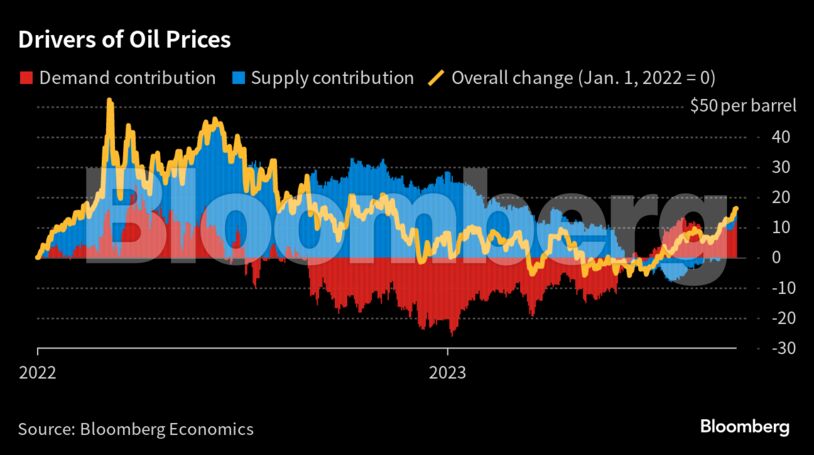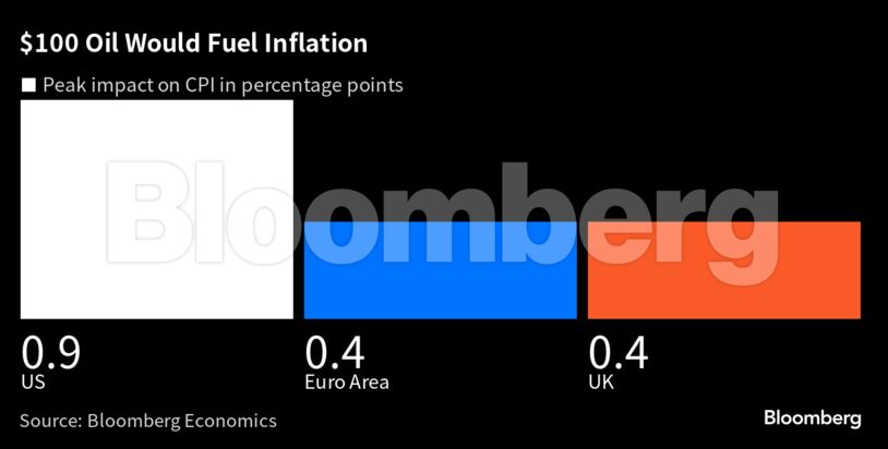 Εάν, εν τέλει, τα $100/βαρέλι γίνουν κάτι το συνηθισμένο κατά τη διάρκεια του δ’ τριμήνου του έτους, αυτό θα μπορούσε να αυξήσει τον πληθωρισμό των ΗΠΑ κατά 0,9%, σύμφωνα με το Bloomberg και 0,4% στην Ευρωζώνη και τη Βρετανία.