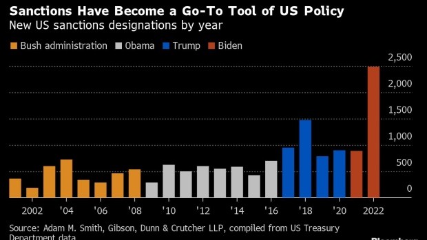 Οι οικονομικές κυρώσεις αυτές οι οποίες τότε θεωρούνταν ισοδύναμες με μία «οικονομική πυρηνική βόμβα», ανακοινώθηκαν το απόγευμα της 26ης Φεβρουαρίου του 2022. Τις επόμενες ημέρες, η ισοτιμία του ρουβλίου κατέγραψε ιστορική πτώση, οι τιμές των προϊόντων στη χώρα εκτινάχθηκαν στα ύψη, ενώ οι Ρώσοι πολίτες έσπευσαν στις τράπεζες σε ένα «πυρετώδες» bank run. Ορισμένοι από τους εργαζομένους του Λευκού Οίκου πίστευαν πως αντέδρασαν υπερβολικά. Δεν ήθελαν να διαλύσουν εξ ολοκλήρου τη ρωσική οικονομία, δεδομένης της πιθανής «μετάδοσης» της κρίσης τόσο στην Ευρώπη όσο και στον υπόλοιπο κόσμο.