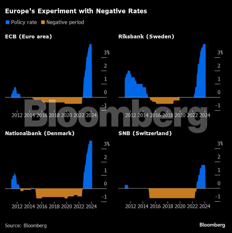 Ξεκινώντας από τη Δανία, τα αρνητικά επιτόκια εφαρμόστηκαν στην Ελβετία, τη Σουηδία και τη ζώνη του ευρώ για διαφορετικούς λόγους που κυμαίνονταν από την ανάσχεση των τεράστιων εισροών στο ελβετικό φράγκο έως την υποκίνηση της αύξησης των τιμών στον απόηχο της κρίσης δημόσιου χρέους στην περίπτωση της ΕΚΤ.