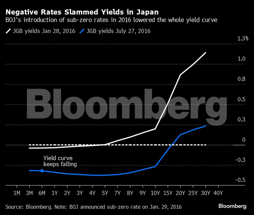 Έπειτα από περισσότερο από μια δεκαετία αποπληθωρισμού, η BοJ προχώρησε σε μείωση του επιτοκίου σε αρνητικό πρόσημο το 2016, λίγες μόλις ημέρες αφότου ο τότε διοικητής Χαρουχίκο Κουρόντα αρνήθηκε δημοσίως ότι εξέταζε το ενδεχόμενο αυτής της κίνησης.