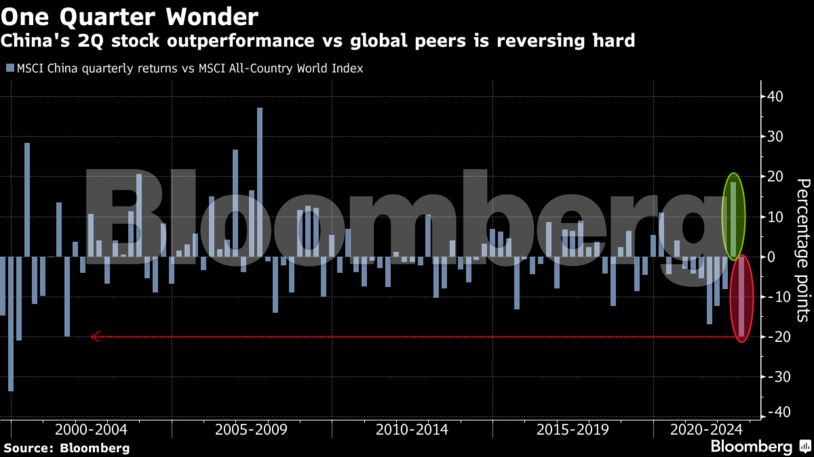 Ο δείκτης MSCI China Index έχει καταγράψει πτώση της τάξης του 12% αυτό το τρίμηνο σε σχέση με τη γενική άνοδο της τάξης του 8% παγκοσμίως παρά την εξαιρετική απόδοση των κινεζικών μετοχών το β’ τρίμηνο.