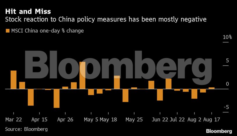 Εκ των τουλάχιστον 25 υποσχέσεων των ρυθμιστών για τη στήριξη της κινεζικής οικονομίας από τις 16 Μαρτίου, μόνο οι τέσσερις έχουν οδηγήσει σε άνοδο των μετοχών άνω του 2%. Οι αναλυτές έχουν προχωρήσει σε εκκλήσεις για περαιτέρω μέτρα στήριξης από τότε, αλλά φαίνεται πως παραμένουν απογοητευμένοι από τα μέτρα υποστήριξης της ρευστότητας των εταιρειών, της μείωσης των επιτοκίων των στεγαστικών δανείων και τη μείωση του κόστους δανεισμού.