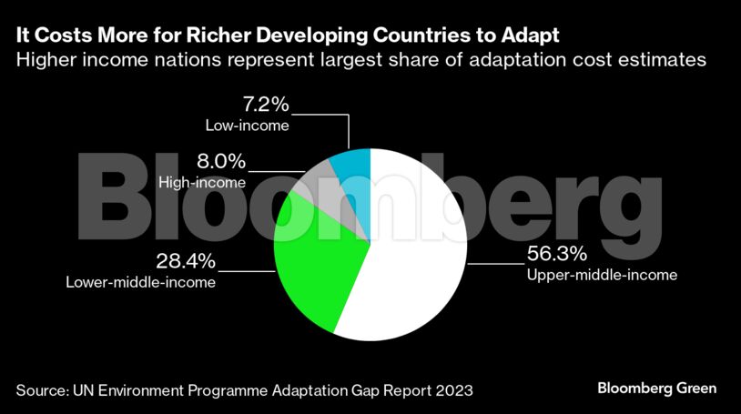 Η έκθεση του UNEP τονίζει ακόμα δύο σημαντικά σημεία για τη χρηματοδότηση έως το 2030: Το πρώτο αφορά στις σχετικές χρηματοδοτικές ανάγκες προσαρμογής ανά χώρα σύμφωνα με το εισόδημα. Όπως σημειώνεται οι χώρες ανώτερου και χαμηλού-μεσαίου εισοδήματος έχουν το υψηλότερο «απόλυτο κόστος» για την προσαρμογή. Παρ΄όλα αυτά, οι επενδυτικές απαιτήσεις προσαρμογής των πλουσιότερων χωρών είναι σχετικά χαμηλές όταν εξετάζονται ως μερίδιο των επιπέδων εισοδήματός τους. Οι χώρες χαμηλού εισοδήματος, παρά τις μικρότερες ανάγκες τους, έχουν πολύ υψηλότερο επενδυτικό βάρος προσαρμογής ως ποσοστό του ΑΕΠ στο 3,5%. Αυτό καθιστά ακόμη πιο σημαντική τη διεθνή στήριξη τέτοιων προσπαθειών.