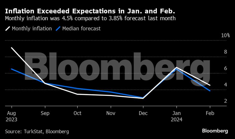 Σύμφωνα με πρόσφατη έρευνα της κεντρικής τράπεζας οι προοπτικές για τον πληθωρισμό στο τέλος του έτους αυξήθηκαν κατά περισσότερο από μια ποσοστιαία μονάδα σε πάνω από 44,2% αυτόν τον μήνα, πολύ υψηλότερα από τις τρέχουσες προβλέψεις των φορέων χάραξης πολιτικής. Η μηνιαία αύξηση των τιμών, ένας δείκτης που παρακολουθείται στενά από την κεντρική τράπεζα της Τουρκίας, επιταχύνθηκε στο 4,5% τον Φεβρουάριο.