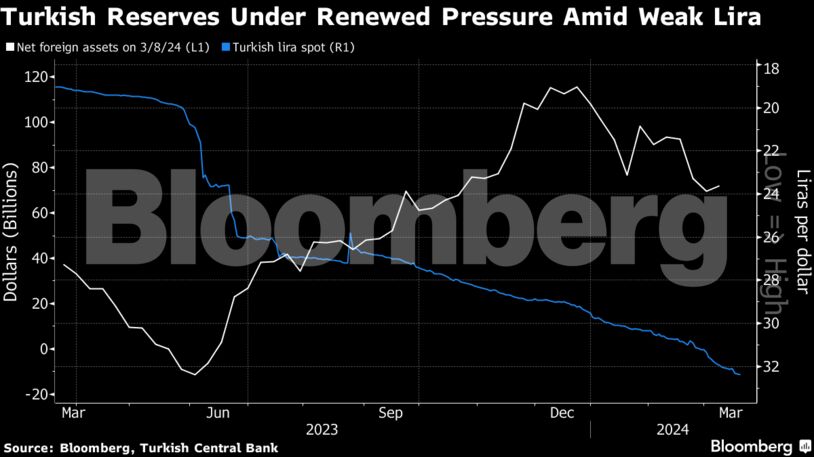 Η αυξημένη ζήτηση για μετρητά ενόψει των τοπικών εκλογών της 31ης Μαρτίου επιταχύνει την υποτίμηση της λίρας και συμβάλλει στη μείωση των συναλλαγματικών αποθεμάτων, καθώς οι προοπτικές για τον πληθωρισμό χειροτερεύουν.