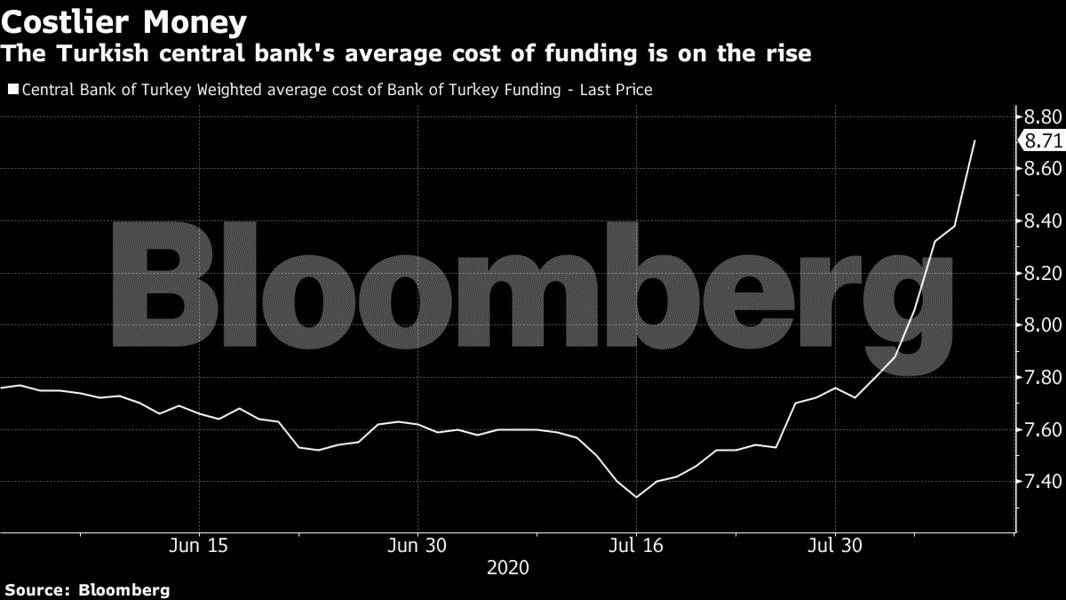 Προκειμένου να χαλαρώσει τις πιέσεις που δέχεται η τουρκική λίρα χωρίς να αυξήσει το βασικό της επιτόκιο η κεντρική τράπεζα της Τουρκίας παρείχε στις τράπεζες της χώρας ένα πιο ακριβό κανάλι χρηματοδότησης, τη δημοπρασία repo ενός μηνός.