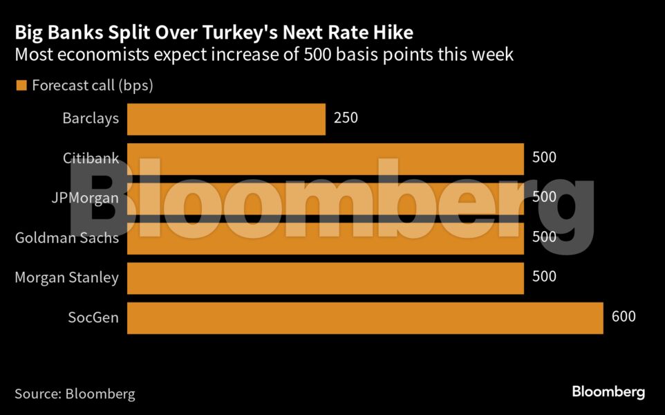 Αν και οι προβλέψεις διαφέρουν σημαντικά, οι περισσότεροι οικονομολόγοι που συμμετείχαν στην έρευνα του Bloomberg προβλέπουν αύξηση κατά 500 μονάδες βάσης στο 30% την Πέμπτη, την τέταρτη κατά σειρά υπό τη διοίκηση της Χαφίζ Γκαγιέ Ερκάν.