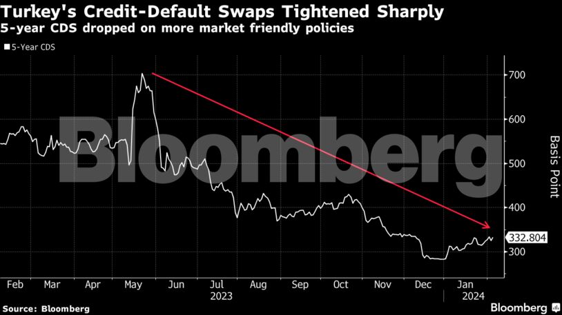 Παρ’ όλα αυτά, το κόστος ασφάλισης του τουρκικού κρατικού χρέους έναντι χρεοκοπίας με τη χρήση 5ετών CDS μειώθηκε υπό των 300 μονάδων βάσης από τα τέλη του περασμένου έτους, από τις 700 μονάδες βάσης τον Μάιο. Η πρόσθετη απόδοση που ζητούν οι επενδυτές για να συνεχίσουν να επενδύουν στα τουρκικά ομόλογα έναντι των αμερικανικών κρατικών ομολόγων κατέγραψε παρόμοια μείωση σύμφωνα με τους δείκτες της JPMorgan.