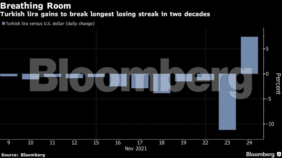 Η τουρκική λίρα στις 4:15 μ.μ. (τοπική ώρα) στην Κωνσταντινούπολη ενισχύονταν έναντι του δολαρίου κατά 11% και η ισοτιμία διαμορφώνεται στις 11,587 λίρες ανά δολάριο. Η σημερινή αποκλιμάκωση στις πιέσεις που δέχεται η λίρα ακολουθεί ένα πτωτικό σερί 11 ημερών το οποίο διαμόρφωσε τις ετήσιες απώλειες της από τις αρχές του χρόνου στο 38%, τη χειρότερη επίδοση μεταξύ των αναδυόμενων αγορών που παρακολουθεί το Bloomberg.