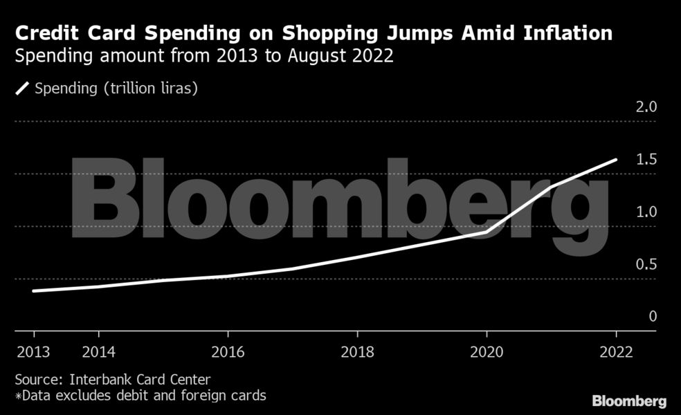 Συνολικά, οι καταναλωτές είχαν δημιουργήσει 364 δισεκατομμύρια λίρες (περίπου 20 δισεκατομμύρια δολάρια) σε χρέη πιστωτικών καρτών έως τις 28 Οκτωβρίου, σχεδόν το διπλάσιο ποσό σε σχέση με πέρυσι, σύμφωνα με τα στοιχεία που συνέταξε η τουρκική τραπεζική επιθεώρηση.